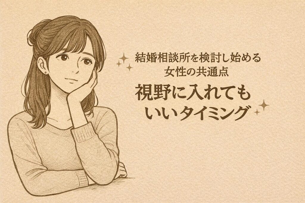 「結婚相談所って、自分が行く場所なのかは分からないけど、少しだけ気になり始めている」 そんな感覚を持ち始めた女性は、実は少なくありません。 それは“決断したから”ではなく、今の婚活に、少し違和感を覚え始めたから。 この記事では、結婚相談所を検... -